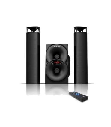 سیستم صوتی فیلیپس MMS4200 از دیگر سیستم های صوتی PHILIPS است که از قدرت صوتی 50 وات بهره می برد. این سیستم صوتی 2.1 کاناله بوده و از 2 اسپیکر عمودی و 1 ساب ووفر تشکیل شده است، به همراه یان مجموعه ی صوتی یک عدد ریموت کنترل نیز عرضه می گردد که از راه دور تنظیمات دلخواه شما را در اسرع وقت انجام خواهد داد. وجود ساب ووفر در این سیستم صوتی تولید و پخش صداهای ریز و بم را با کیفیت و وضوح بالا ممکن ساخته است، تا جایی که با کمک این سیستم صوتی می توان از جزئیات دقیق صدا لذت برد. فیلیپس برای سیستم صوتی 2.1 کاناله ی خود بدنه ی مشکی رنگ را انتخاب نموده است، که اتفاقا از جنس پلاستیک هم می باشد. کیفیت بالای مواد به کار رفته در ساخت این سیستم صوتی کیفیت این دستگاه را تضمین می کند. مجهز بودن به پورت USB و جک 3.5 میلی متری صدا و ورودی AUX اتصال سیستم صوتی را به دستگاه های دیگر ممکن می کند. در کنار این ویژگی ها خالی از لطف نخواهد بود که به قابلیت پخش کانال هایی قرار گرفته بر روی امواج FM اشاره کرد.