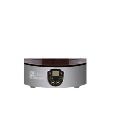 میوه خشک کن ناسا الکتریک NS-1161 دستگاهی دیجیتالی است و از جدیدترین میوه خشک کن های این شرکت است. این میوه خشک کن دارای موتوری قدرتمند با توان مصرفی 350 وات بوده و برای مصارف خانگی بیشتر مورد استفاده قرار می گیرد و نمی توان انتظار کارآیی میوه خشک کن های حرفه ای و صنعتی را از آن داشت. میوه خشک کن ناسا NS-1161 انواع میوه ها و سبزیجات را با بالاترین کیفیت خشک می کند. شما می توانید میوه های خشک شده را برای مدت زمانی تعیین شده در داخل محفظه ی میوه خشک کن نگهداری کنید و این از ویژگی های برتر این دستگاه حرفه ای می باشد. 5 طبقه یا سینی که برای خشک کردن میوه و سبزی در نظر گرفته شده است، نیاز شما را به کلی تامین خواهد کرد و حجم زیادی از مواد غذایی را در هر بار استفاده خشک خواهد نمود. قابلیت های مهم این میوه خشک کن کنترل پنل دیجیتالی آن است که امکان تنظیم نمودن دما و زمان را می دهد. همچنین سیستم خاموش شدن خودکار نیز دستگاه را پس از اتمام مدت زمان تعیین شده خاموش می کند. بدنه ی شفاف سینی میوه خشک کن امکان دیدن محتویات داخل را به شما خواهد داد و همین عامل باعث می شود تا در مصرف انرژی صرفه جویی و هر بار ناچار به باز کردن درپوش دستگاه نباشید.